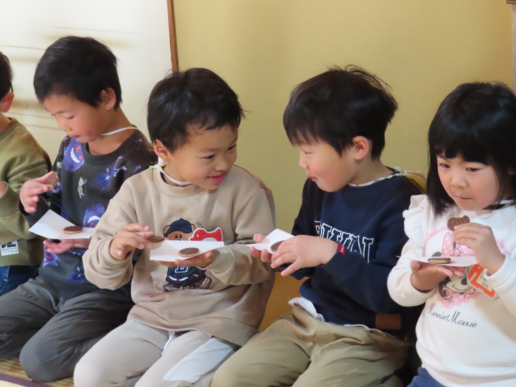 臼と杵でお餅つきをしました。元気いっぱいの「よいしょ!、よいしょ!」の応援の声が園庭に響き渡っていました。できた鏡餅は、全てのクラスと、園長先生のお寺に飾りにいきます。「来年が良い年になりますように。皆が健康に過ごせますように」とお祈りします。