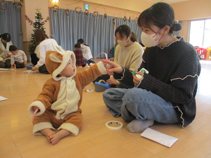 ちょっと前まで、赤ちゃんだったお友達もお兄ちゃんやママが製作しているのを一緒にやってみたいなあって、のぞき込んでみたり、おもちゃで遊んで待っていられるようになりました。いつか一緒に作ろうね。