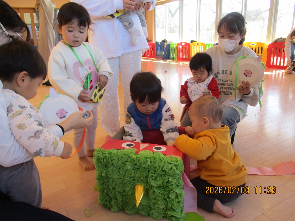 紙皿で鬼の豆入れを作りました。折り紙をビリビリ破いてかっこいい鬼のパンツが出来上がり♪ 皆で豆まきもしました