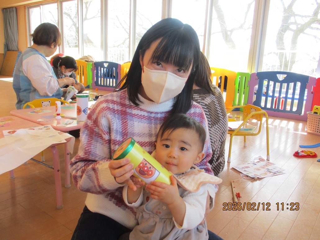 今年最初の製作は紙コップにシールを貼って真ん中にはペットボトルキャップを貼って、はさみで切り込みを入れると...あっという間に『コマ』のできあがり。作った後は暖かいお部屋でたっぷり遊びました