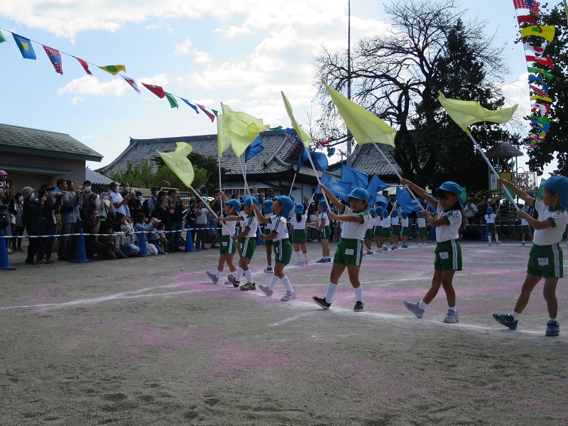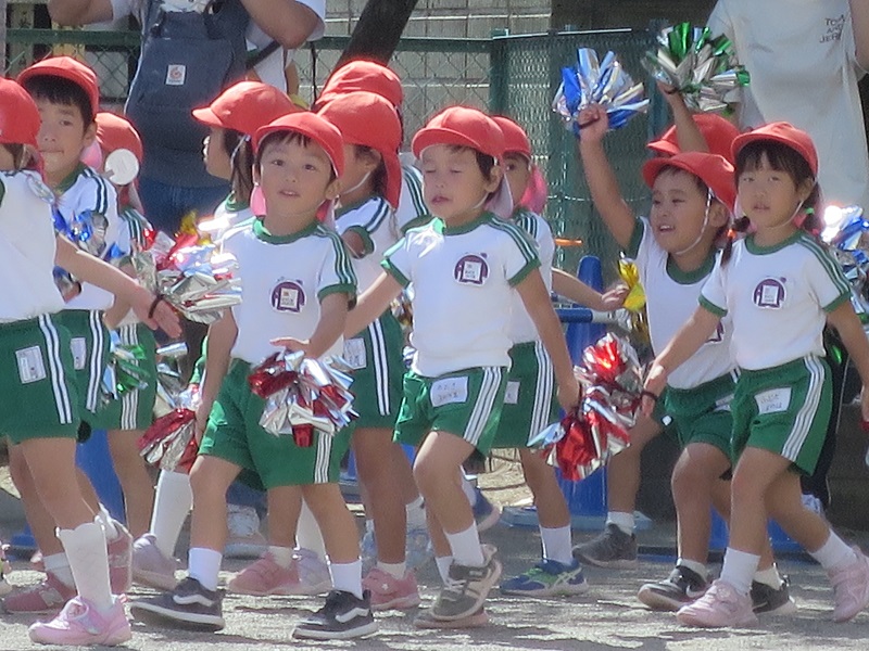 鼓隊合奏「さんぽ」「あお、きいろ」 4歳児のポンポン隊は「あお、きいろ」の曲に合わせて表現しました。運動会では0歳児から5歳児の子ども達がみんな頑張りました。一生懸命な姿がカッコよかったですよ。