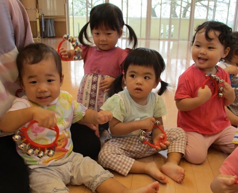 今日のリトミックはボールを使って楽しみました。ピアノに合わせて、歩いたり走ったり寝てみたり。みんな楽しく参加していました。