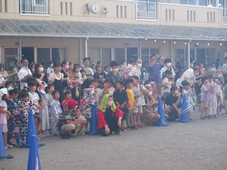 納涼祭は、にこにこランド主催の行事ですが、未就園児・在園児はもちろんのこと、卒園児が来てくれるのも嬉しいです。どの卒園児も背が伸びて落ち着いて、みんな成長を見せてくれるので先生たちは感動します。