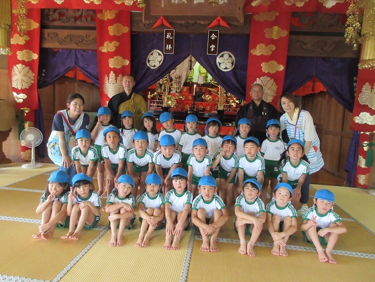 龍傳寺の本堂で座禅会をしました。座禅は毎年4月の花祭りでも行っているので、足の組み方も慣れていて上手でした。理事長先生が「座禅をすると気持ちが落ち着いて優しい子になれます。」と教えてくださいました。終わったあと皆が優しいお顔になっていましたよ。