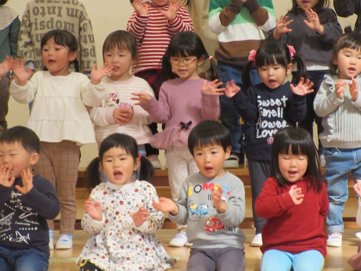 1歳児さんは「おやつをたべよ」を歌いながら手遊びをしました。5歳児さんは、知っている歌なので手遊びを一緒にしながら盛り上げてくれました。みんなの気持ちが1つになって会場が楽しさで、いっぱいになりました。