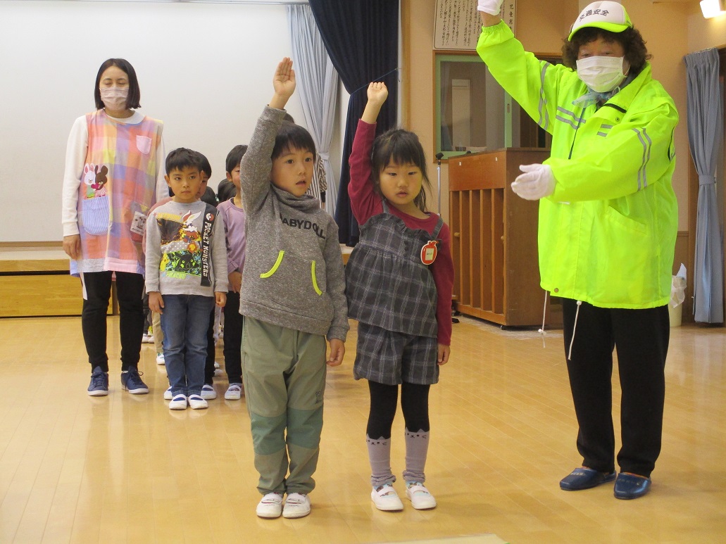 今日は、渋川警察署のお巡りさんが来園してくれて皆に交通ルールを教えてくれました。市役所の方や地域の安全さん達もお手伝いに来てくれました。きちんと手を挙げて・・信号を見て・・渡ります。