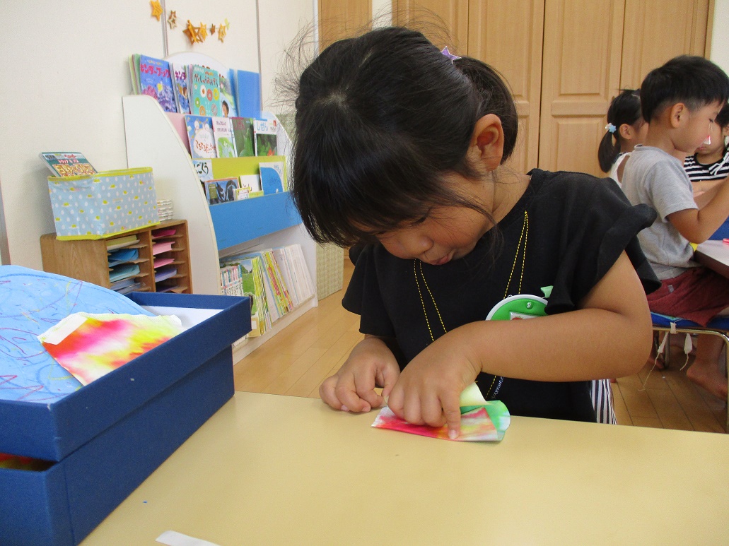 七夕製作でマーカーを使ってみたよ!!綺麗な色がたくさんありました。僕たち私たちの願いがお空まで届きますように・・(^▽^)/