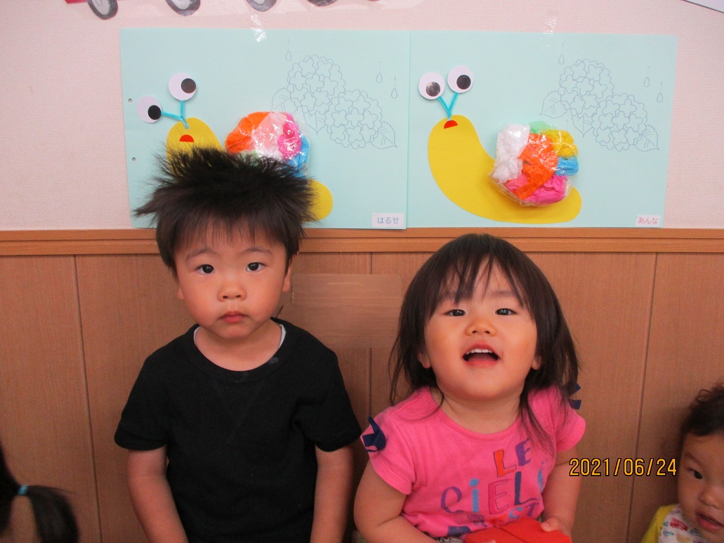 かたつむりを作りました。ピンク、赤、黄など色々な色の、おはながみを使って作りました。とっても楽しかったです♪