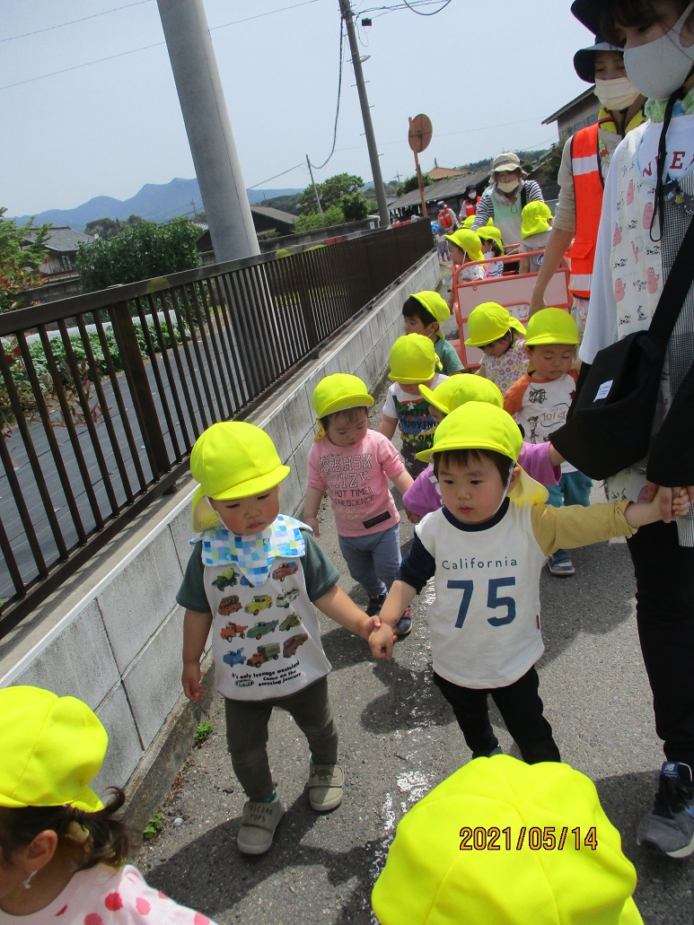 園周辺をお散歩しました。神社でお参りしたり、田んぼを見学したりしました。皆、泣かずに元気です。