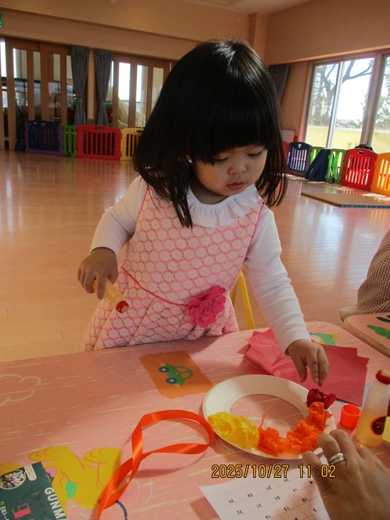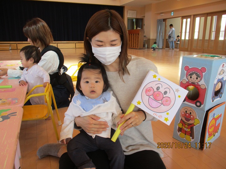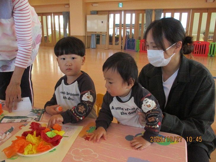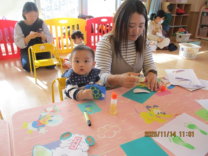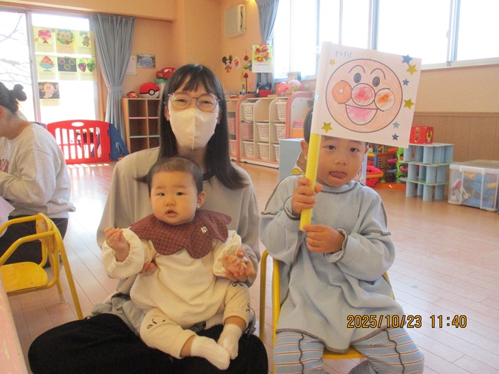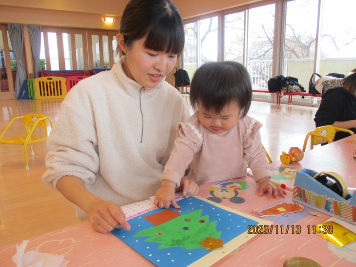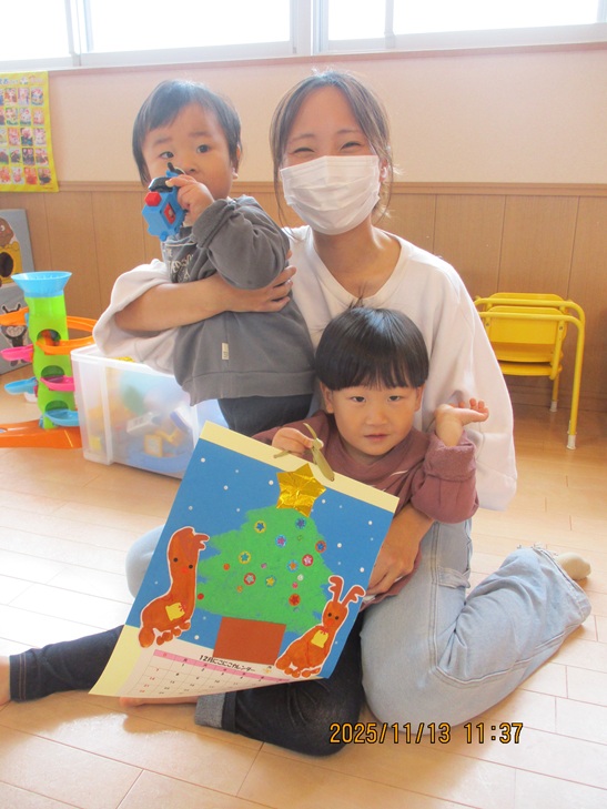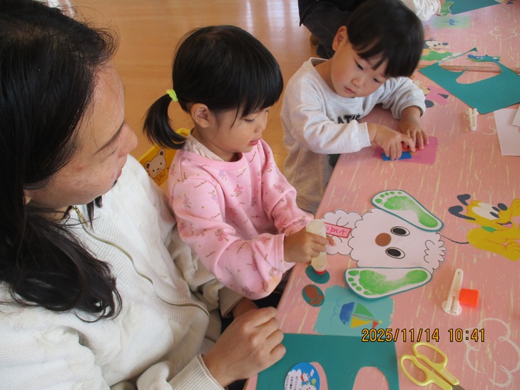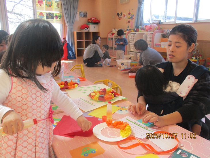 ちょっと前まで、赤ちゃんだったお友達もお兄ちゃんやママが製作しているのを一緒にやってみたいなあって、のぞき込んでみたり、おもちゃで遊んで待っていられるようになりました。いつか一緒に作ろうね。