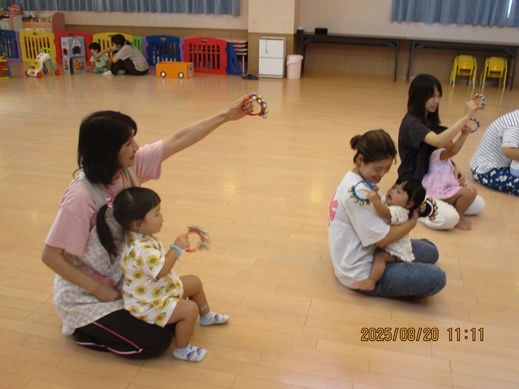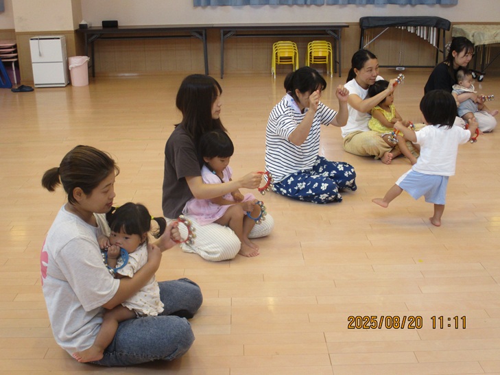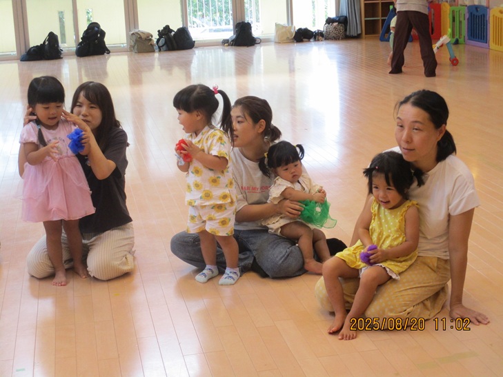 今月のリトミックは小さい子も楽しめる スカーフを使ったリズム遊びでした。音楽に合わせて鈴を鳴らしたり楽しみました
