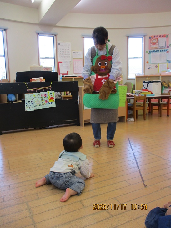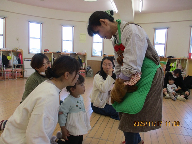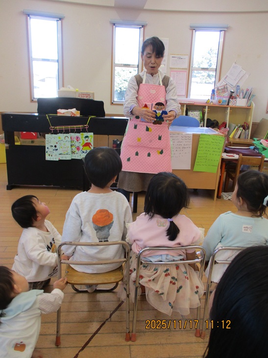 いつも楽しいおはなしアイアイ★今回は『金のガチョウ』と『食いしん坊のゴリラ』のエプロンシアターや秋のうたをたくさん歌いました。
