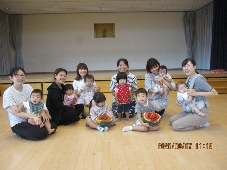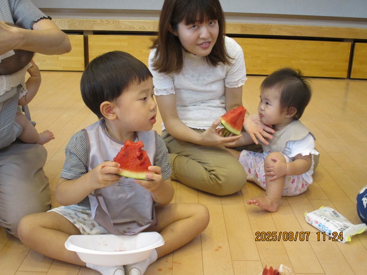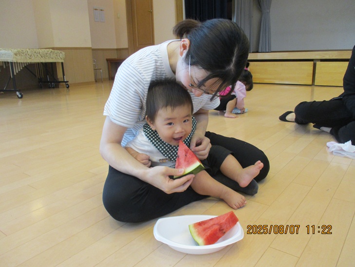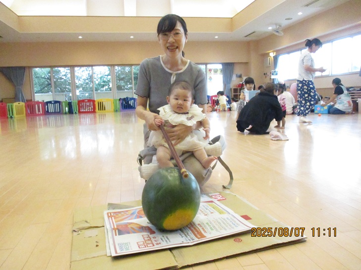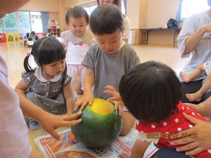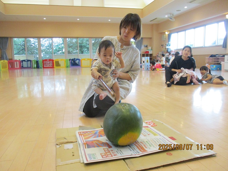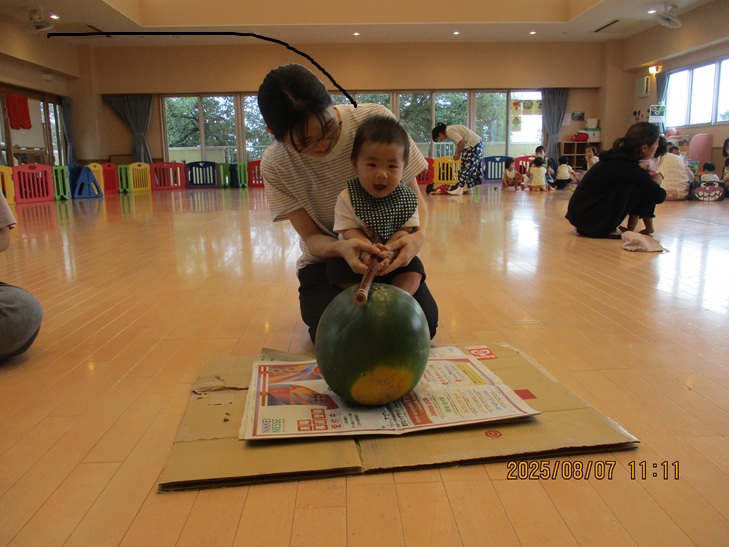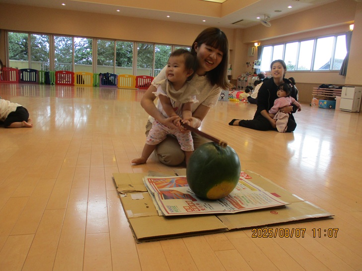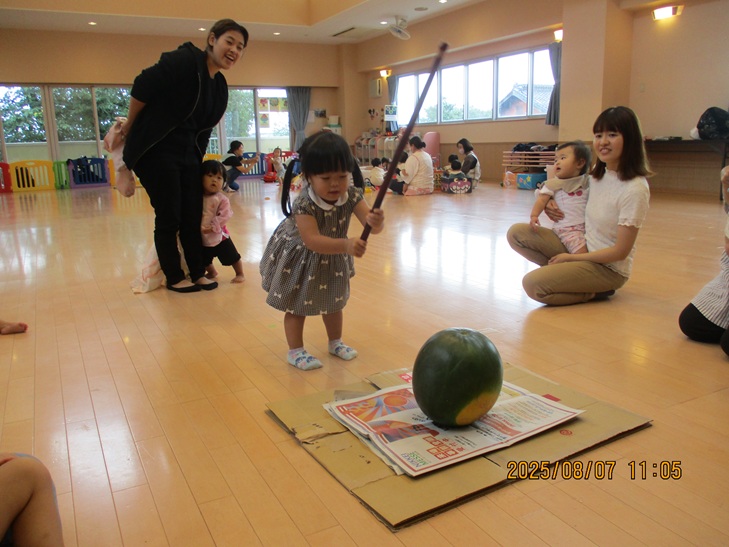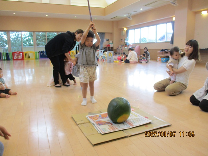 今年もスイカ割りをしました。大きなスイカを皆で叩いて割りました。おなかいっぱい食べました