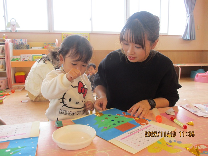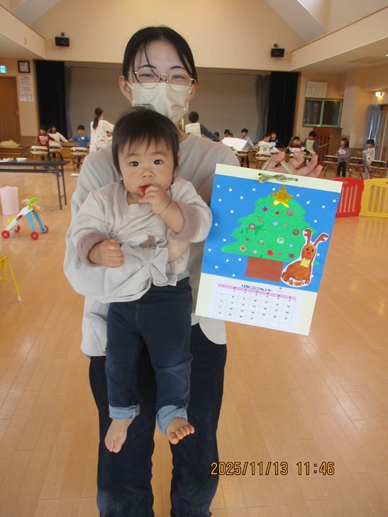 12月のカレンダーを作りました。新聞紙でツリー、綿棒で雪を作って形の違うスタンプ遊びを楽しみました。足型を使ったトナカイもとってもかわいくできました♪