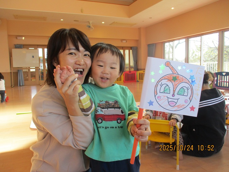 ちょっと前の活動になりますが...にこにこランド運動会の応援グッズを作りました。イラストを真剣にクレヨンでぬりぬりしたらかわいい旗ができたよ。