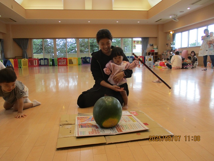 今日のスイカ割は雨天のため、遊戯室で行います。
