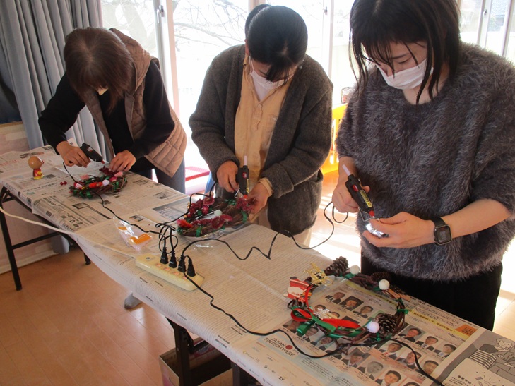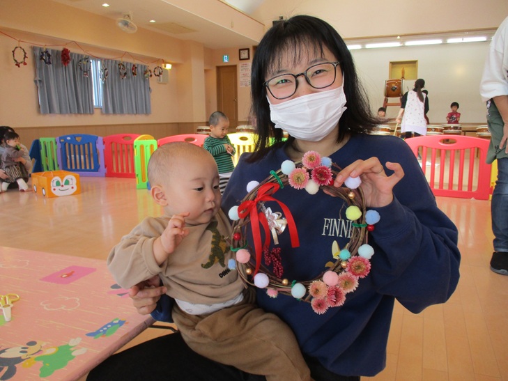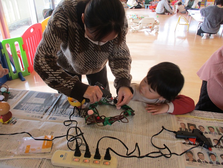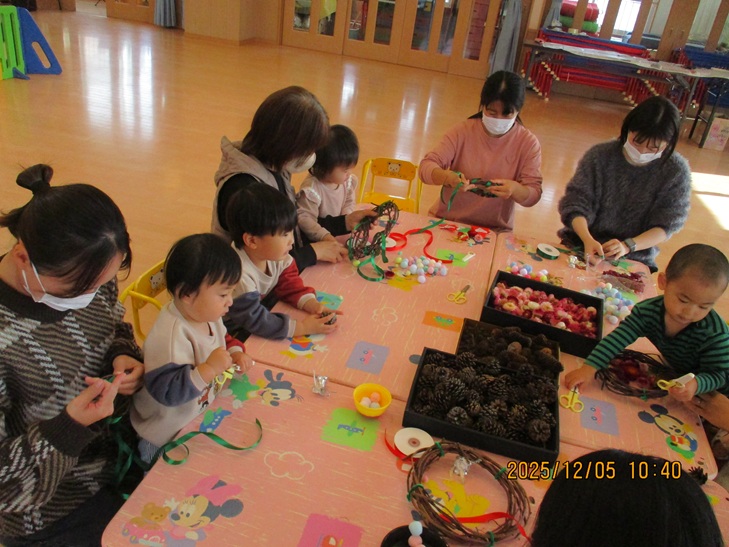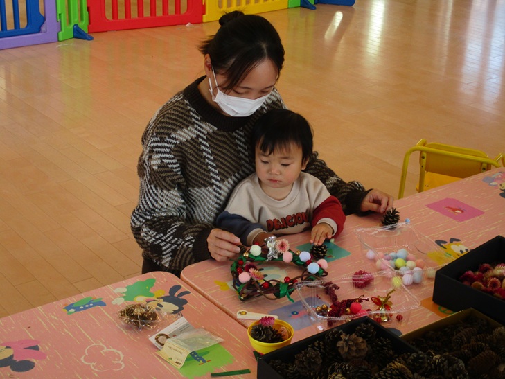 松ぼっくりや木の実❁貝細工❁というお花を使ってクリスマスリース製作をしました綺麗に配置できたらグルーガンを使って、くっつけていきますグルーガンは熱くて危ないのでママたちも真剣です
