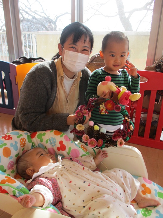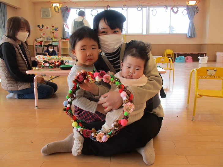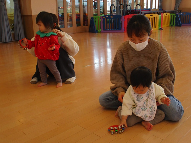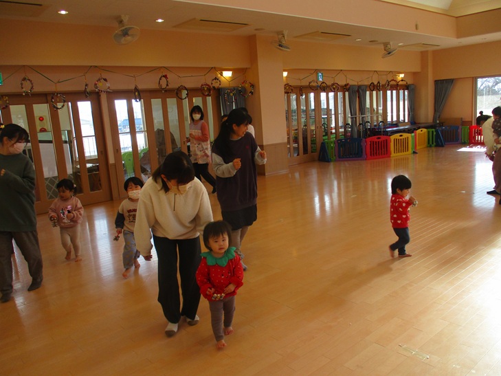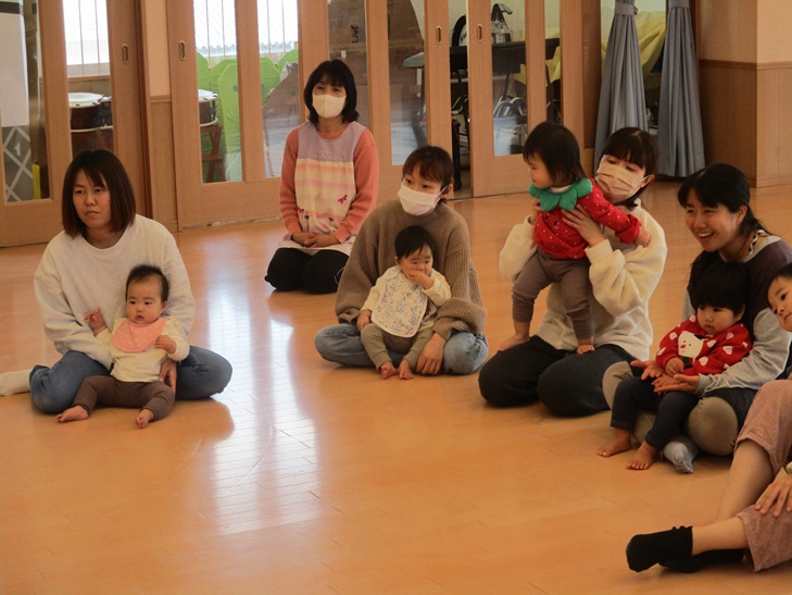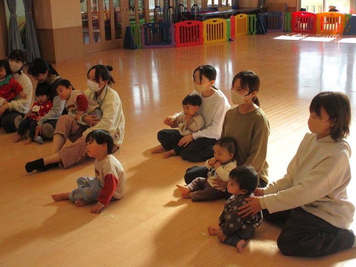 今年初のリトミック。綺麗な色のスカーフを使い、歌に合わせて身体をなでたり、上に投げてみたり楽しみました。お正月にちなんだお餅の絵本も真剣に見ていました。